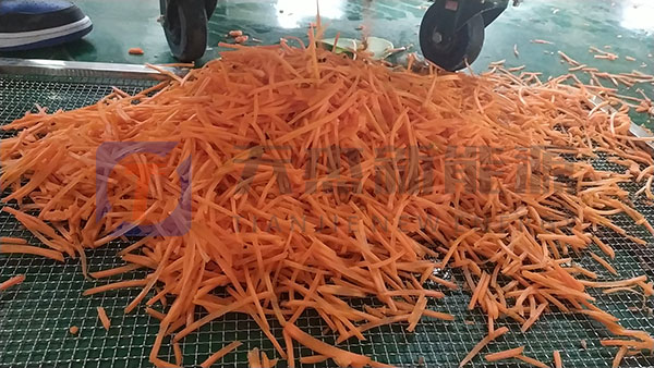 2.機械切粒。將處理好的胡蘿卜再用清水沖洗一次,之后勻稱地送入切菜機切粒。常制作的規(guī)格為10、8與5毫米三種。
