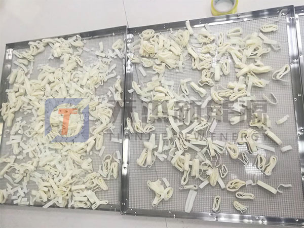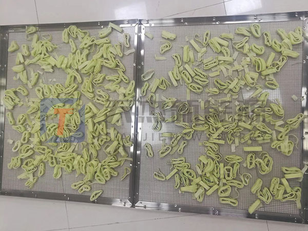 面條烘干機工藝介紹:冷風(fēng)定條階段:剛進(jìn)入面條烘干機內(nèi)的濕面條長度一般在1.4m左右,水分大,容易斷。這個階段就是要除去面條表層的一部分水分,固定組織,增加強度。這個階段面條烘干機設(shè)備溫度為 20-30℃,強通風(fēng),時間為30分鐘,水分由 32%~35%下降為 27%~28%。